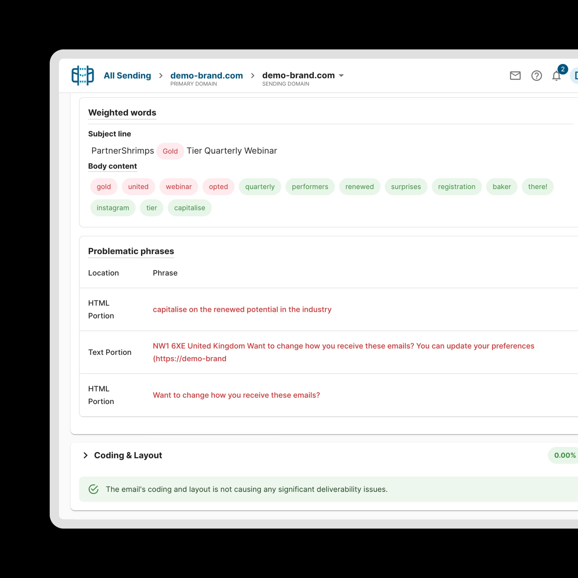 Uncover words, phrases, or code snippets in your email that could get flagged by a spam filter.