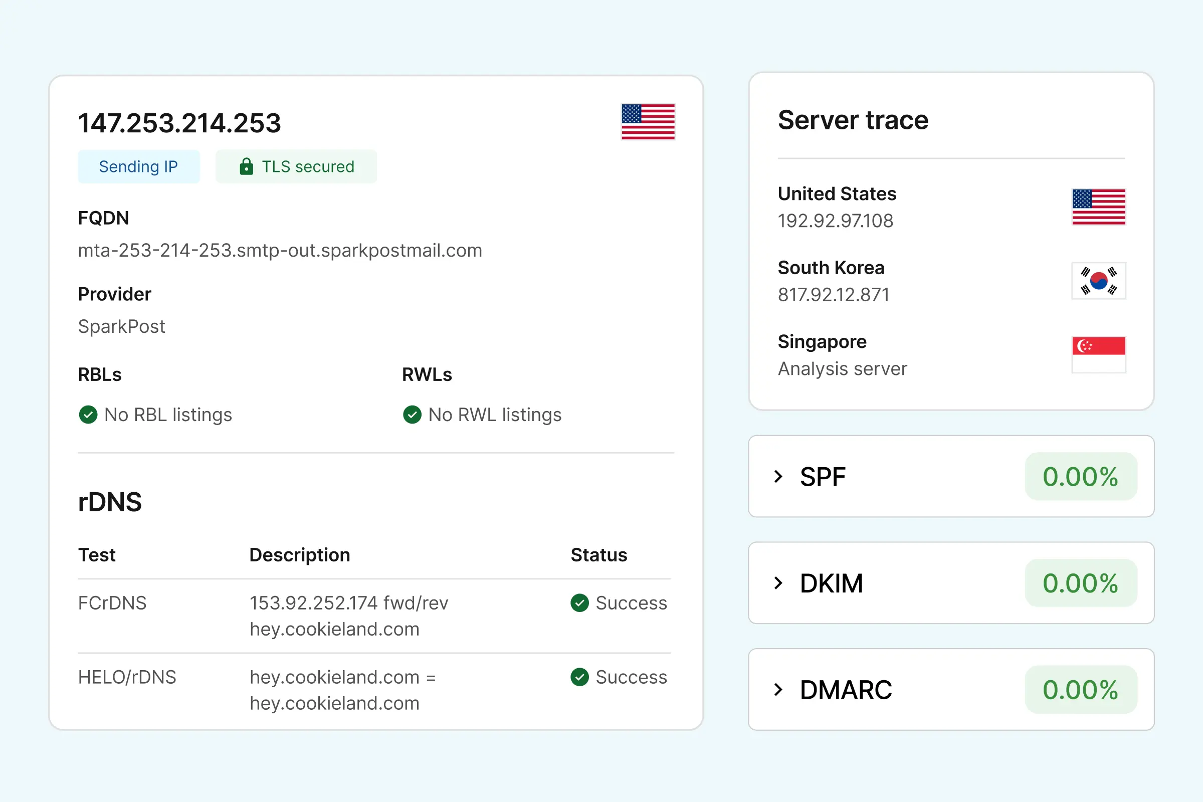 Automatically test every layer of your sending infrastructure. Apply rDNS tests, see an email's received route, and validate email authentication