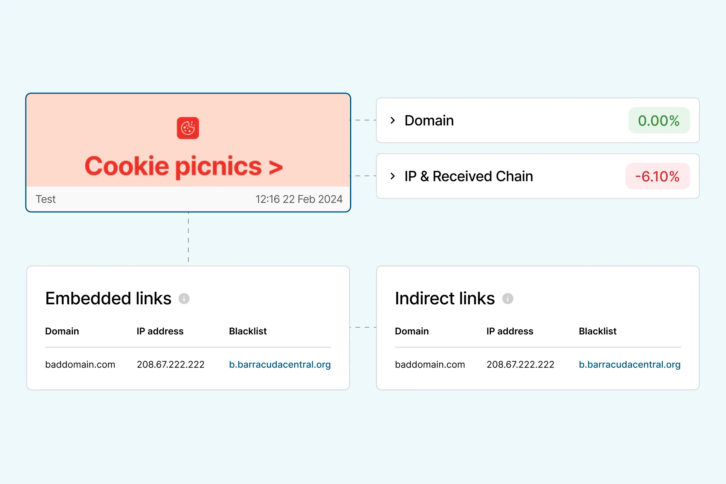 Ensure your sending IP and domain isn't blocked. Review email links and headers for blacklist activity. Advanced scanning even follows links to test third-party websites.